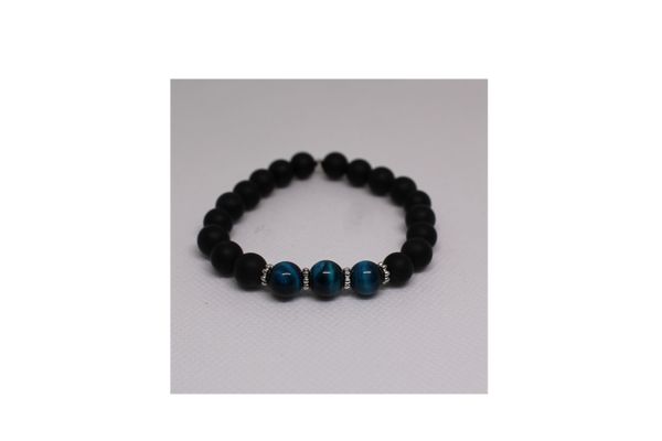 bracelet de perle noir mat avec trois perle oeil de tigre bleu