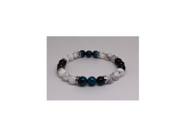 Bracelet de perle howlite blanche, oeil de chat bleu et noir brillant