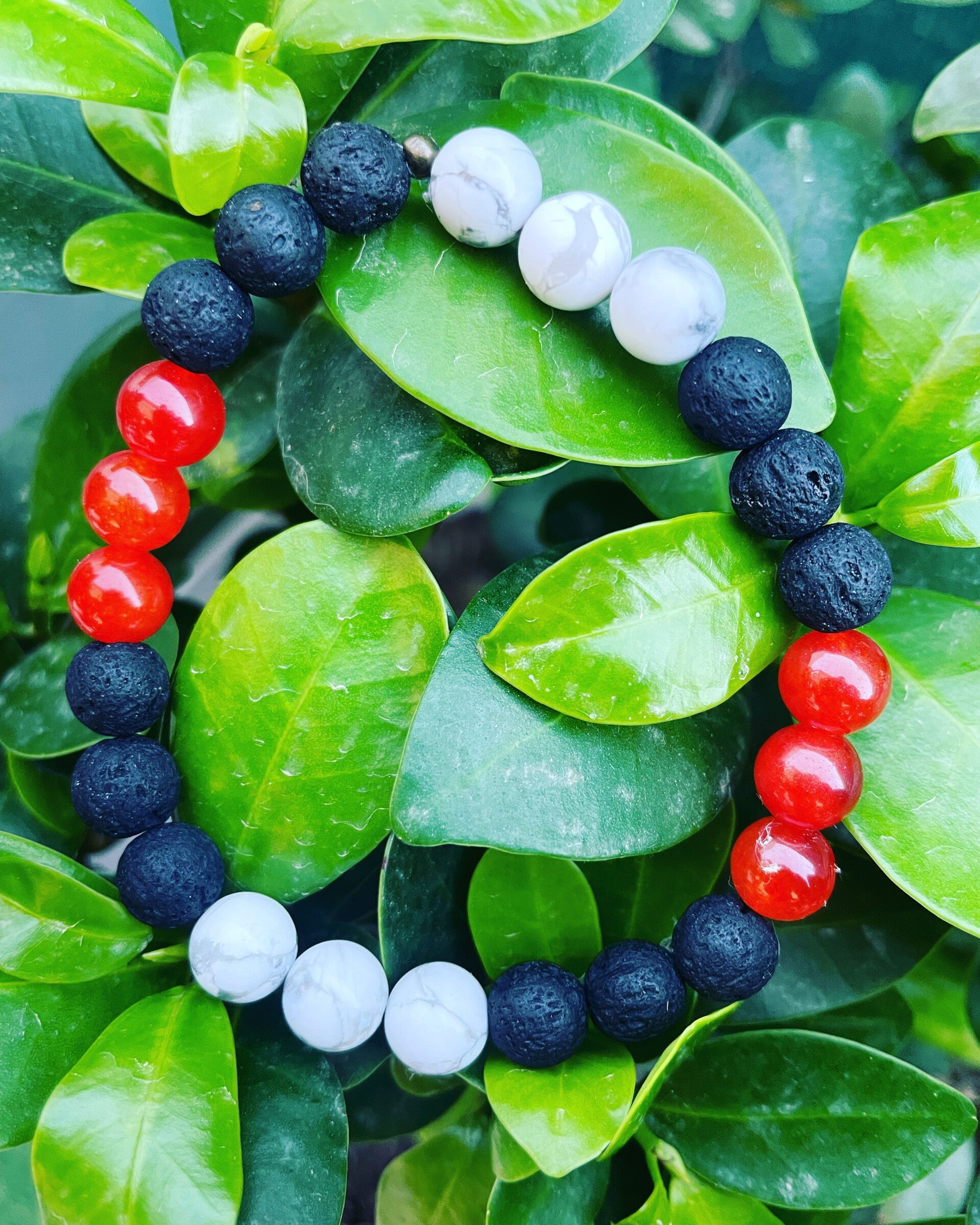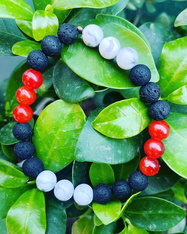 Bracelet de perle semi précieuse howlite blanche, agate rouge et lave volcanique.